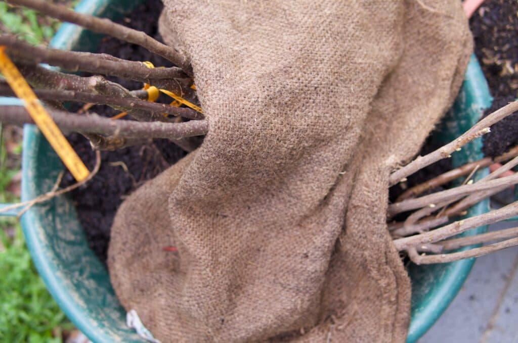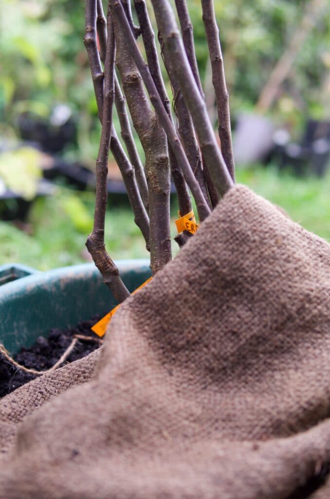 - Les pommiers que je suis en train de planter au fur et à mesure qui attendent dans un bac couvert de composts.