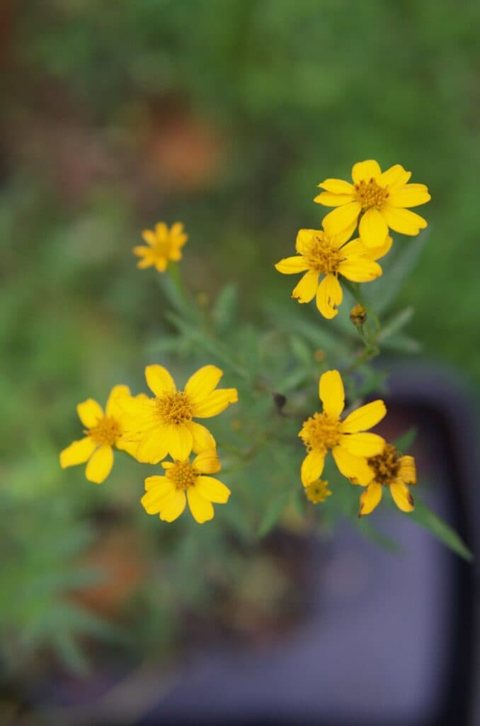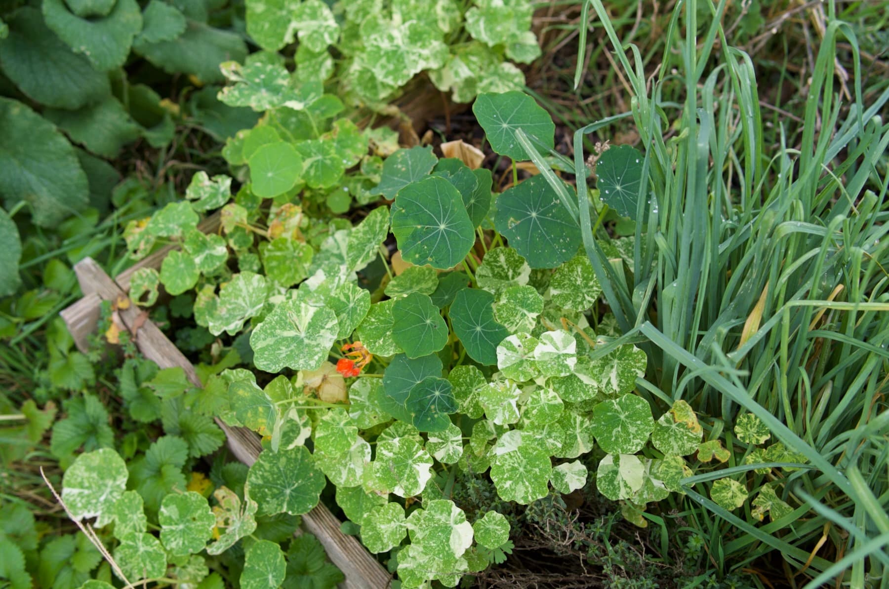 - Dans un bac, j’ai des poireaux perpétuels, du gingembre, des capucines, des marrube blanc. À coté quelques cosmos.